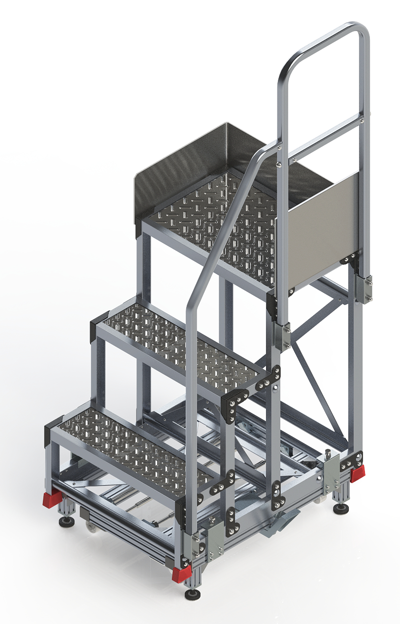 二人で運んでいた踏み台が一人で移動可能となり、4つのアジャスターで安心して使用できるようになりました